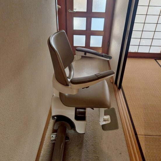 【新着順】階段昇降機の設置事例・お客様の声「く」の字曲げレールで玄関が広く使えるように