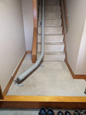 「く」の字型レールレイアウトのおかげで、玄関に階段昇降機を置いたままにしておいても「まったく邪魔にならない」とのことでした。