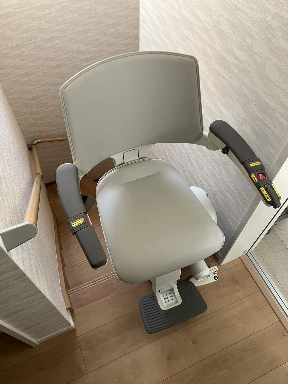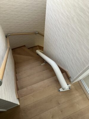 階段昇降機取り付け後も、他のご家族の方が、階段の広い側を安全に上り下りができるよう、手すりを残し、レールは内回りに設置しました。